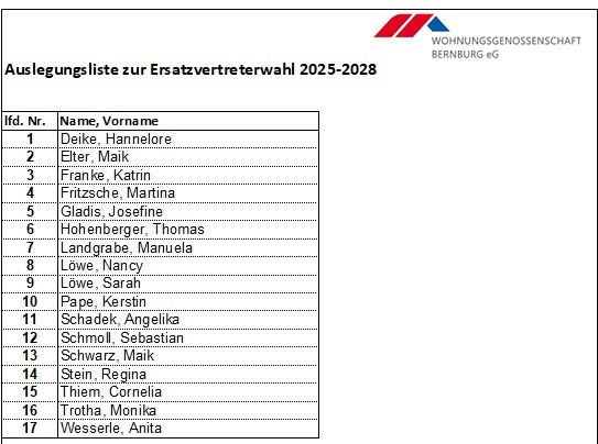 Die vom Wahlausschuss aufgestellte Kandidatenliste zur diesjährigen Wahl der Ersatzvertreter:innen wird zur Einsichtnahme für unsere Genossenschaftsmitglieder vom 06.10.2025 bis zum 20.10.2025 hier auf unserer Webseite veröffentlicht und liegt zudem zur Einsichtnahme während unserer Sprechzeiten in der Geschäftsstelle Semmelweisstraße 26, 06406 Bernburg aus.